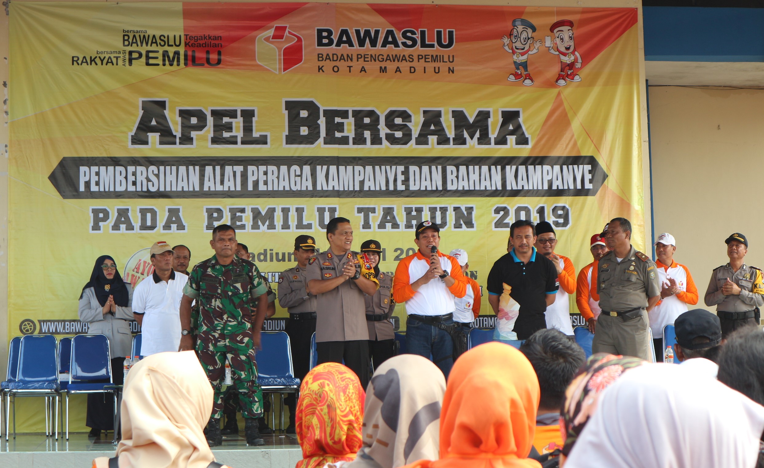 Memasuki masa tenang kampanye, Badan Pengawas Pemilu (BAWASLU) Kota Madiun mengadakan Apel Bersama dalam rangka pembersihan Alat Peraga Kampanye (APK) dan Bahan Kampanye di seluruh titik di Kota Madiun.