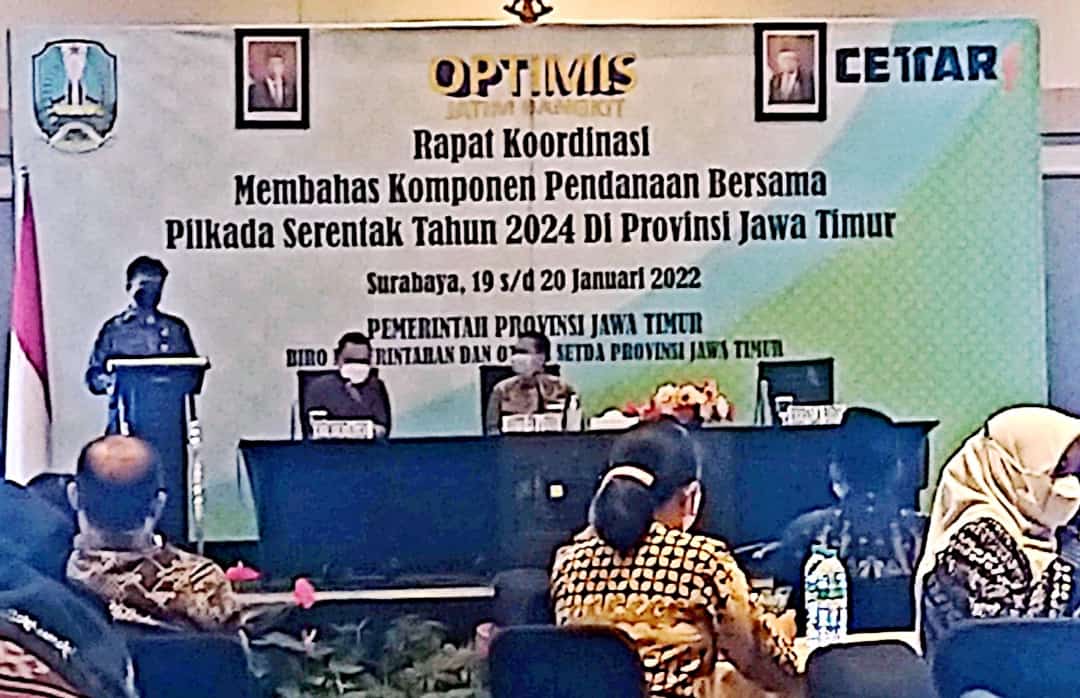 Biro Pemerintahan dan Otoda Setda Provinsi Jawa Timur yang mengadakan rakor menyampaikan, bahwa seluruh Kepala Daerah harus menyiapkan dan cadangan untuk pembiayaan pilkada 2024. Asisten 1 Pemerintah Provinsi Jawa Timur mengatakan pelaksanaan pilkada serentak 2024 harus dipersiapkan sejak dini. "Pelaksanaan pilkada pada november 2024 menjadi perhelatan yang sangat besar harus dipersiapkan sejak dini. Berangkat dari Pilkada 2020, untuk kebutuhan komponen biaya harus dibicarakan bersama. Jadi tidak sulit untuk pembahasannya." Ujar Asisten 1 pemrov Jatim, Benny Sampirwanto.