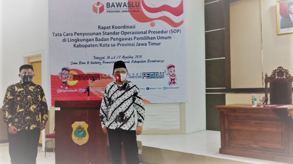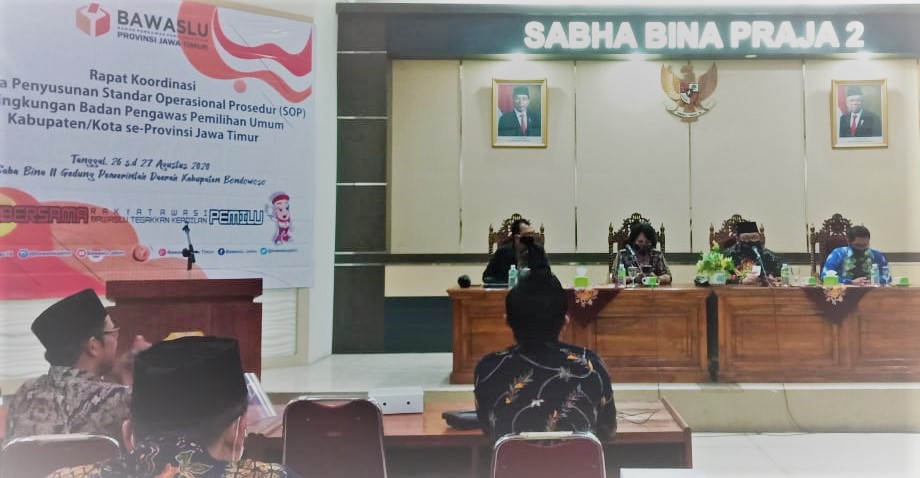 Madiunkota.bawaslu.go.id, Kota Madiun - Bertempat di Sabha Bina Praja Kabupaten Bondowoso, Bawaslu Provinsi Jawa Timur melaksanakan Kegiatan Rapat Koordinasi Tata Cara Penyususnan Standart Oprasional Prosedur (SOP) di Lingkungan Badan Pengawas Pemilihan Umum Kabupaten/Kota se - Provinsi Jawa Timur yang berlangsung selama 2 hari sejak tanggal 26 agustus 2020 hingga 27 agustus 2020.