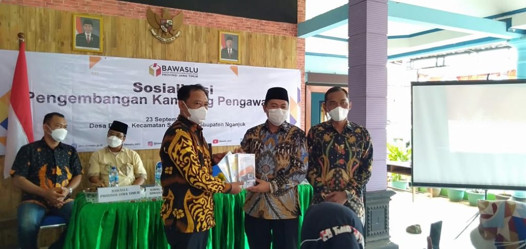 Diketahui, kegiatan ditutup dengan pemberian buku hasil Pengawasan Pilkada oleh Bawaslu Jatim kepada Kepala Desa Duren Sawahan Nganjuk.