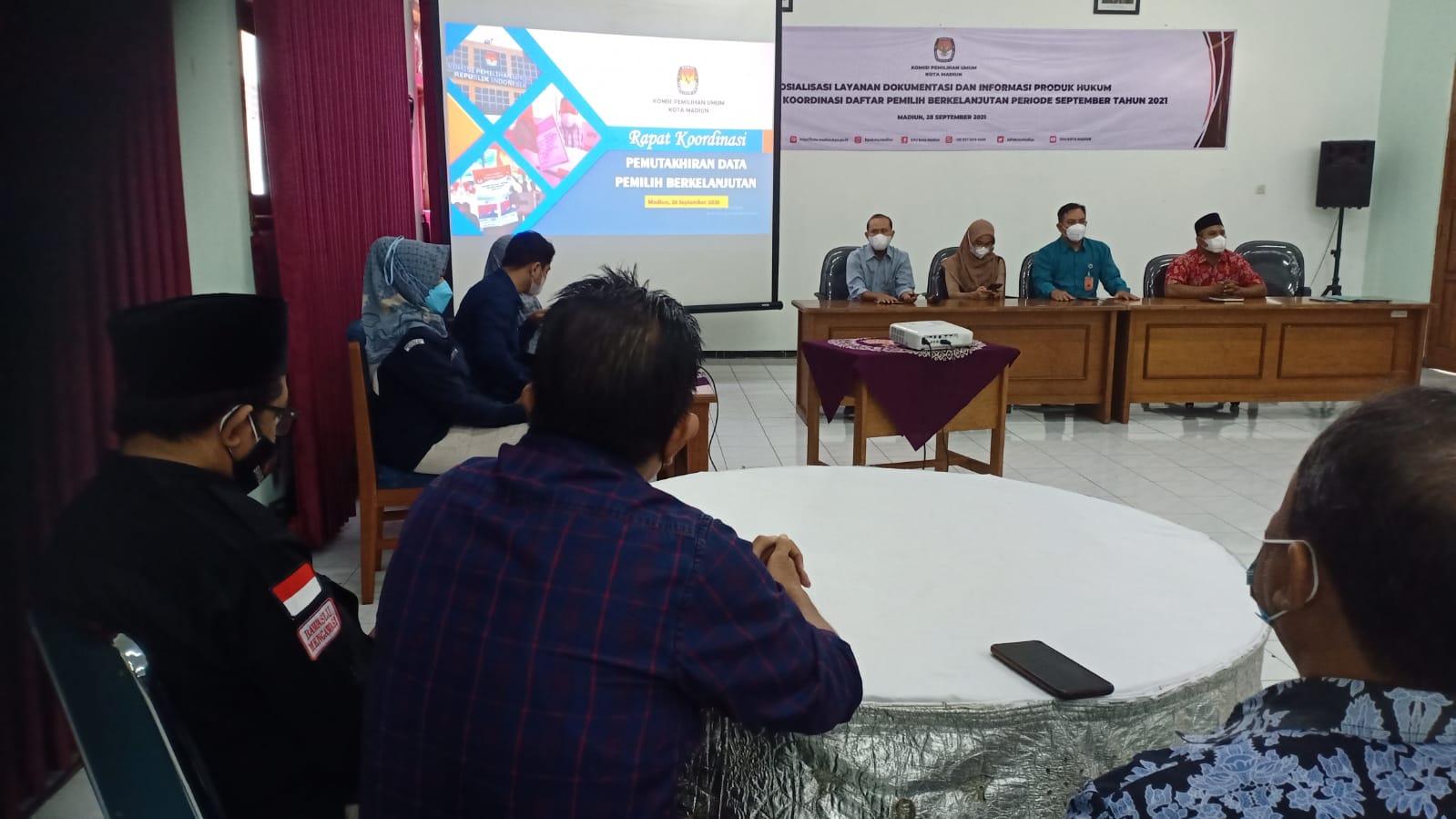 madiunkota.bawaslu.go.id, Kota Madiun - Pada pelaksanaan rapat koordinasi pemutakhiran daftar pemilih berkelanjutan untuk periode September 2021 yang dilaksanakan KPU Kota Madiun, Bawaslu Kota Madiun diundang dan hadir pada hari Selasa 28 Setember 2021 di gedung Diklat Pemerintah Kota Madiun. Acara yang dibuka oleh Wisnu wardhana ketua KPU Kota Madiun ini sekaligus sosialisai layanan dokumentasi dan informasi produk hukum KPU Kota Madiun.