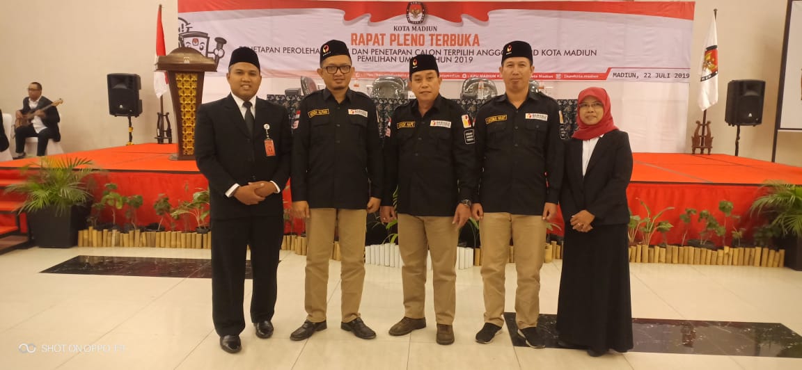 MADIUN - BAWASLU Kota Madiun hadiri Rapat Pleno Terbuka Penetapan Perolehan Kursi Dan Penetapan Calon Terpilih Anggota DPRD Kota Madiun Pemilihan Umum Tahun 2019 di Sun Hotel (22/7) malam. Bawaslu yang hadir adalah Kokok Heru Purwoko (Ketua), Yakobus Wasit Supodo (Anggota), dan Mohda Alfian (Anggota).