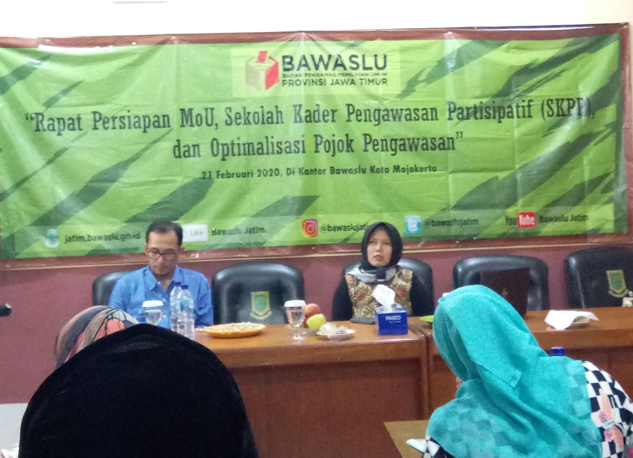 madiunkota.bawaslu.go.id, Kota Mojokerto- Derap langkah Bawaslu Kabupaten/Kota se-Jawa Timur dalam meningkatkan kualitas demokrasi terus ditingkatkan, hal tersebut terbukti dengan diselenggarakannya Rapat Persiapan MoU, Sekolah Kader Pengawasan Partisipatif (SKPP) dan Optimalisasi Pojok Pengawasan oleh Bawaslu Provinsi Jawa Timur untuk 19 kabupaten/Kota yang tidak menyelenggarakan Pilkada 2020 bertempat di Kantor Bawaslu Kota Mojokerto, Jum’at (21/02/2020).