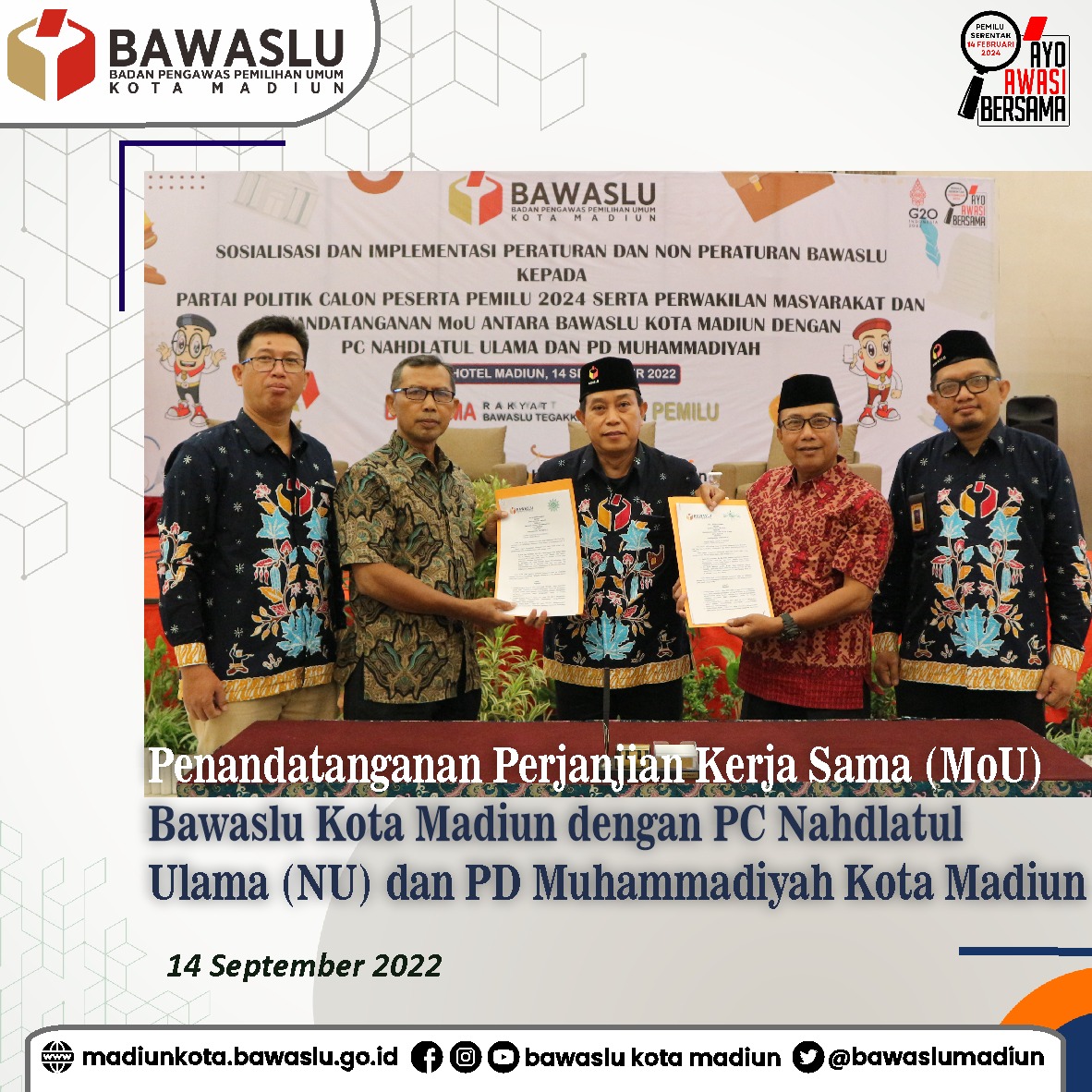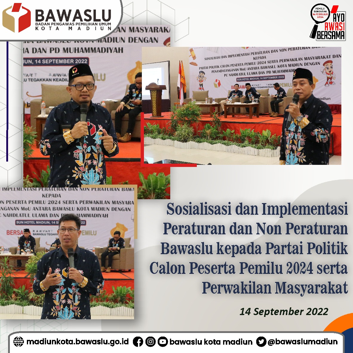 Sosialisasi tahapan pemilu 2024 terus dilakukan oleh Bawaslu Kota Madiun. Pada Rabu (14/9) Bawaslu Kota Madiun mengundang partai politik calon peserta pemilu 2024 untuk menghadiri sosialisasi dan implementasi peraturan dan non peraturan Bawaslu di Sun Hotel Madiun. Selain partai politik, turut hadir pada acara tersebut pengurus PC Nahdlatul Ulama dan PD Muhammadiyah sekaligus penandatanganan MoU dengan dua organisasi keagamaan itu. “Pengawasan tahapan Pemilu 2024 tidak hanya menjadi tanggungjawab Bawaslu namun menjadi tanggungjawab seluruh jajaran masyarakat di Kota Madiun,” Ujar Perwakilan Pengurus PD Muhammadiyah.