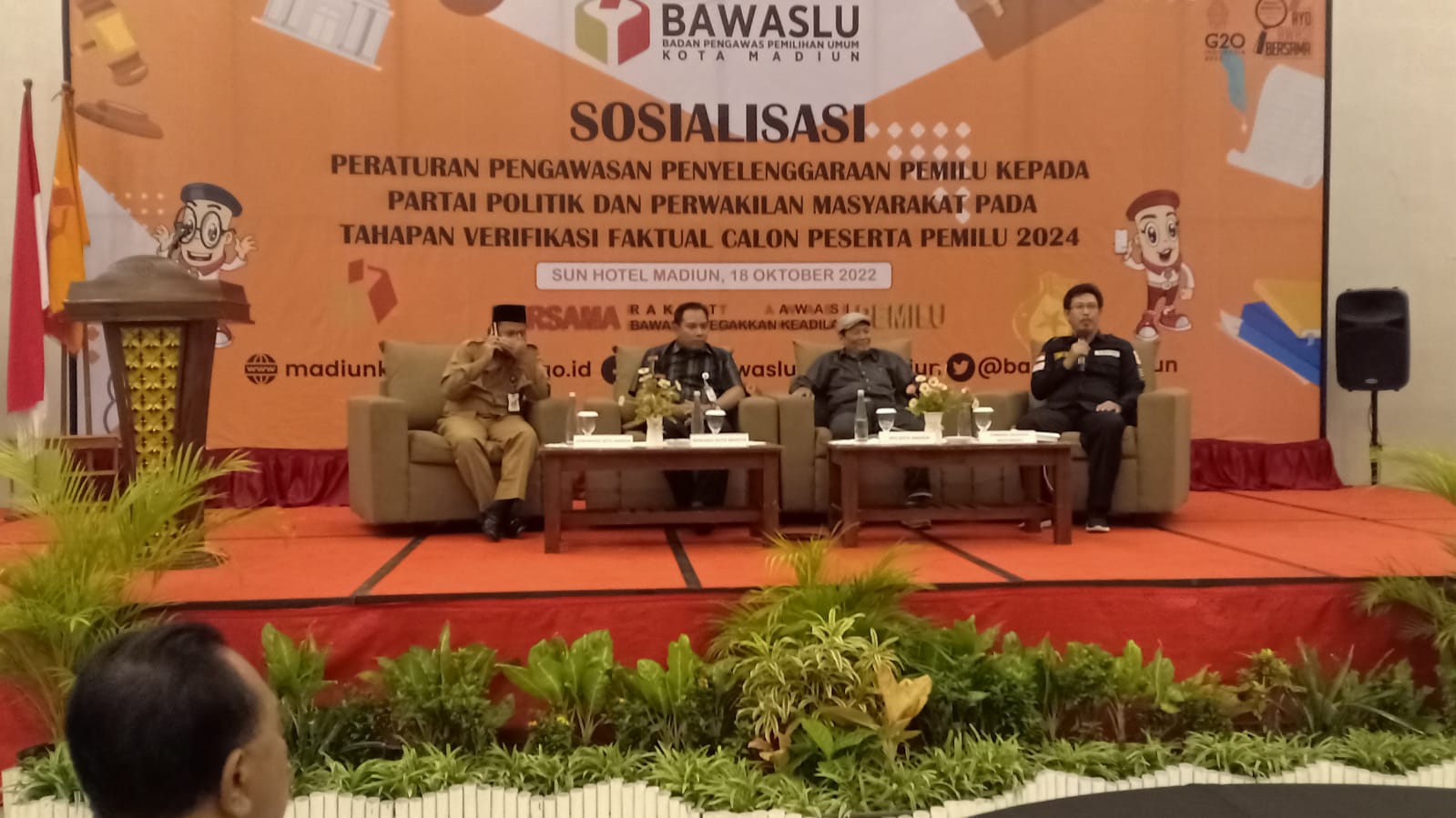 Bawaslu kota madiun. Pada tahapan verifikasi factual (Verfak) partai politik calon peserta pemilu 2024, Bawaslu Kota Madiun pada senin, 18 Oktober 2022 di SUN HOTEL Kota Madiun melaksanakan sosialisasi Peraturan Pengawasan Penyelenggaraan Pemilu kepada Partai Politik dan perwakilan masyarakat pada tahapan verfikasi faktual calon peserta pemilu tahun 2024.