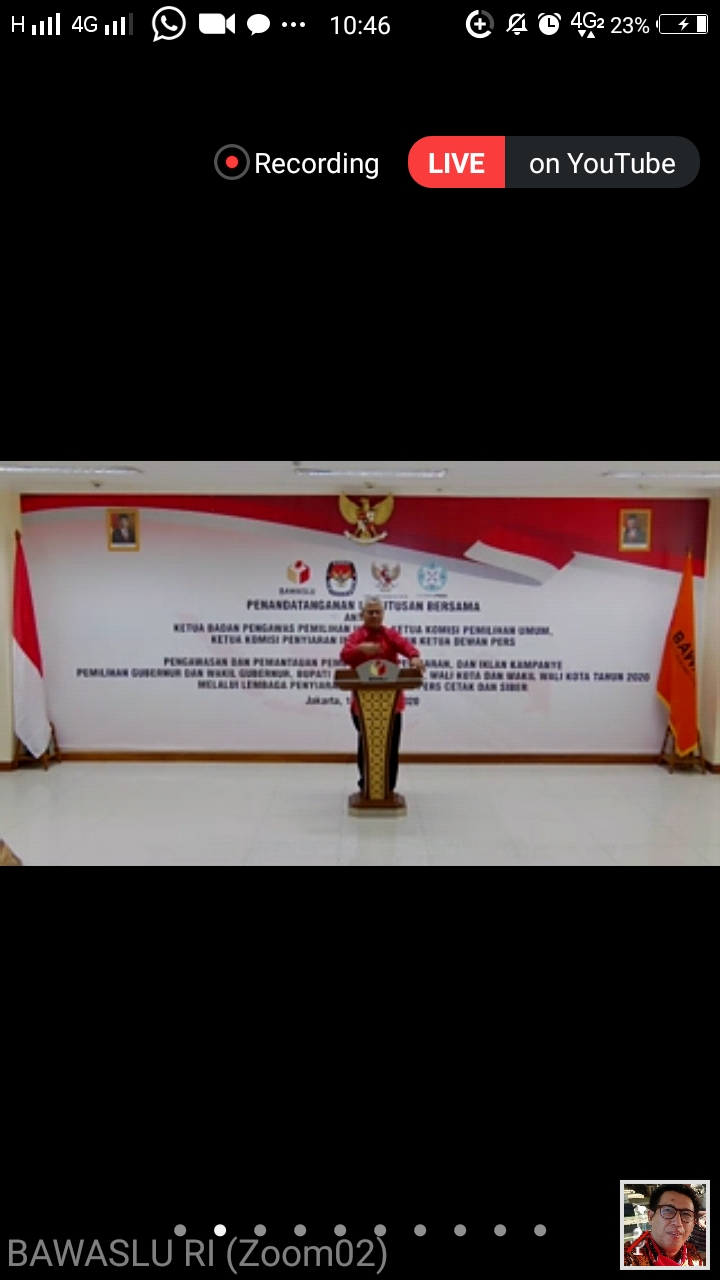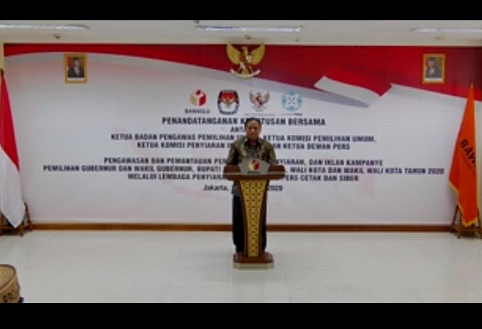 Acara ini adalah Komitmen bersama bersih dari Hoax dan Berita tidak benar serta menjaga semangat nilai-nilai demokrasi pada masyarakat meski di tengah pandemi. Hadir dalam Penandatangan adalah Ketua Bawaslu, Ketua KPU, Ketua KPI, dan Ketua Komisi Hukum Dewan Pers