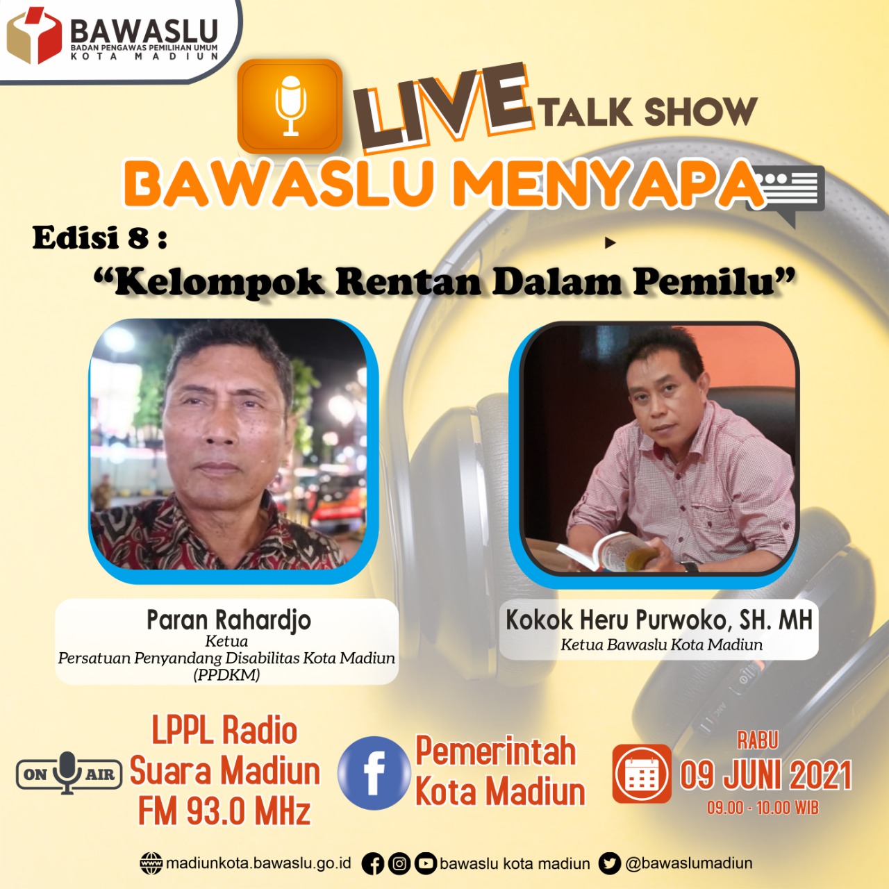 Pada Talkshow "Bawaslu Menyapa" Edisi 8 kali ini menghadirkan narasumber Paran Rahardjo, Ketua Persatuan Penyandang disabilitas Kota Madiun (PPDKM). Acara yang dipandu oleh, Amanda, selaku host dari Suara Madiun cukup menarik karena tema yang diambil berkaitan dengan Kelompok rentan pada penyelenggaraan pemilu. Perlunya kelompok rentan ini diperhatikan agar mendapatkan hak pilih mereka. Dalam hal ini Bawaslu menjamin bahwa mereka mendapatkan hak pilih mereka sesuai dengan tata cara yang baik. Sehingga kelompok rentan ini tidak mudah terhasut oleh kepentingan-kepentingan yang melanggar peraturan.