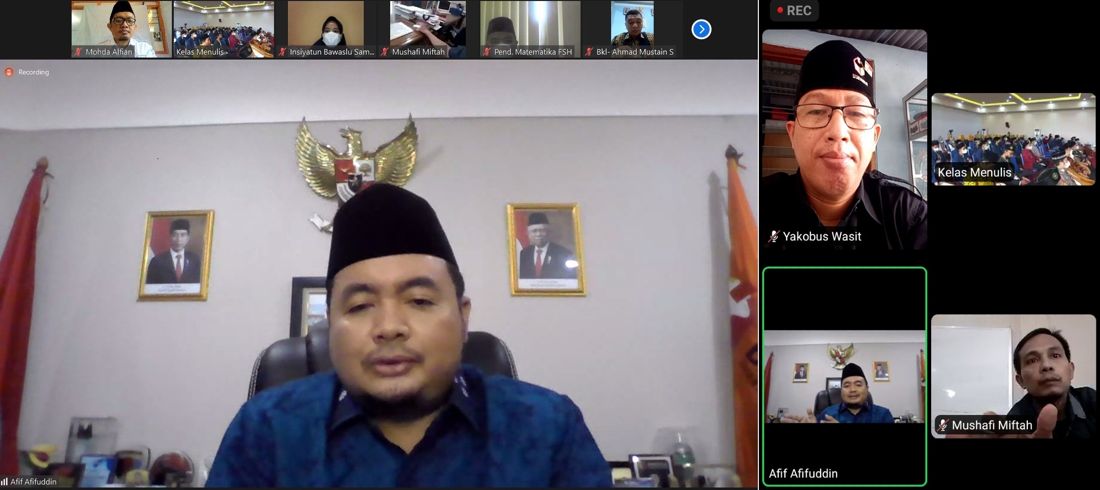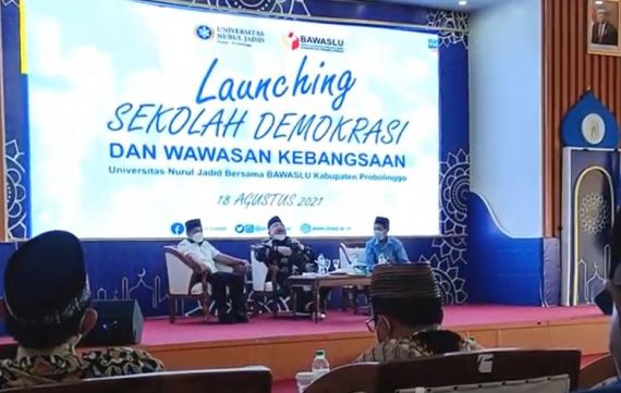 Madiunkota.bawaslu.go.id, Probolinggo- Meskipun ditengah bergulirnya kebijakan (Pemberlakuan Pembatasan Kegiatan Masyarakat) PPKM bagi daerah dengan zona merah di Indonesia, tidak menyurutkan semangat Bawaslu dalam membumikan pengawasan partisipatif. Rabu (18/08/2021) Bawaslu yang diwakili oleh Koordiv Pengawasan dan Sosialisasi, M. Afifuddin membuka kegiatan Sekolah Demokrasi dan Wawasan Kebangsaan di Universitas Nurul Jadid Probolinggo secara hybrid.