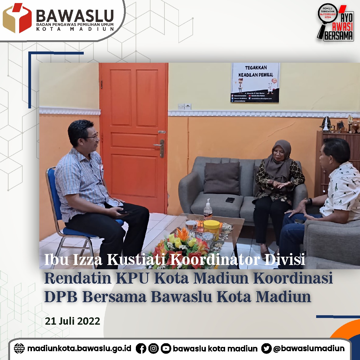 Tahapan pemilu 2024 telah dimulai. Koordinasi terus dilakukan oleh penyelenggara pemilu di Kota Madiun. Pada hari Kamis (21/7), Anggota KPU Kota Madiun, Izza Kustiarti, berkunjung ke kantor Bawaslu Kota Madiun. Disambut oleh Kokok Heru Purwoko & Yakobus Wasit Supodo, Kunjungan tersebut dalam rangka koordinasi terkait sinkronisasi daftar pemilih jelang tahapan pemilu 2024. “KPU koordinasi dengan Bawaslu terkait data pemadanan yang diperoleh KPU dari Kemendagri dengan jumlah TMS meninggal itu 7.000, data anomali 1, data ganda 12.000. Ketiga data tersebut sudah kami cermati. Data anomali dikatakan anomali karena elemen nama diisi dengan NIK,” Ujar izza yang juga Koordinator Divisi Perencanaan, Data dan Informasi KPU Kota Madiun.