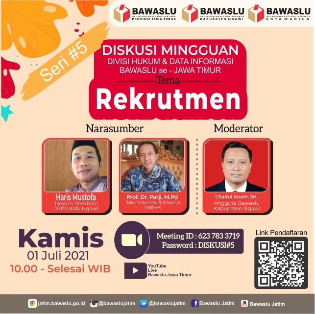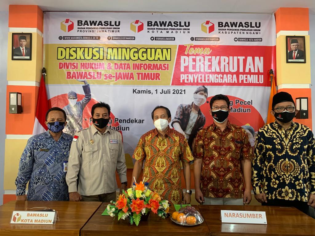 Diskusi rutin yang diselenggarakan oleh divisi hukum & data informasi (HDI) Bawaslu Provinsi Jawa Timur kali ini dengan tema rekrutmen penyelenggara pemilu. Menghadirkan dua narasumber, Harris Mustofa dan Prof. Dr. H. Parji, M.Pd yang juga sekaligus Rektor Universitas PGRI Madiun (UNIPMA). Diskusi yang diselenggarakan secara daring pada kamis (1/7) diikuti oleh 100 peserta. Bawaslu Kota Madiun yang ditunjuk sebagai host acara daring tersebut. Ketua Bawaslu Kota Madiun, dalam sambutannya menyampaikan,” Diskusi mingguan ini diselenggarakan rutin setiap kamis, dan tema hari ini berkaitan dengan rekrutmen penyelenggara pemilu, agar para peserta paham tentang tatacara rekrutmen penyelenggara pemilu yang baik.” Ujar Kokok Heru Purwoko.