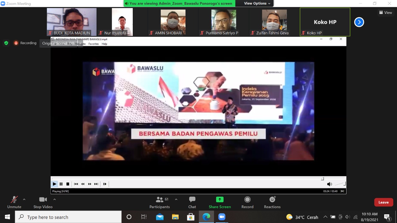 Dalam kegiatan diskusi yang dilakukan secara virtual tersebut Bawaslu Kota Madiun berpartisipasi sebagai peserta, hadir pada diskusi tersebut Kokok Heru Purwoko yang bertindak sebagai Koordinator Divisi HPP Bawaslu kota Madiun serta diikuti oleh Budiyanto dan Setya Hatta Kurniawan sebagai staf Divisi HPP Bawaslu Kota Madiun. (Budi)