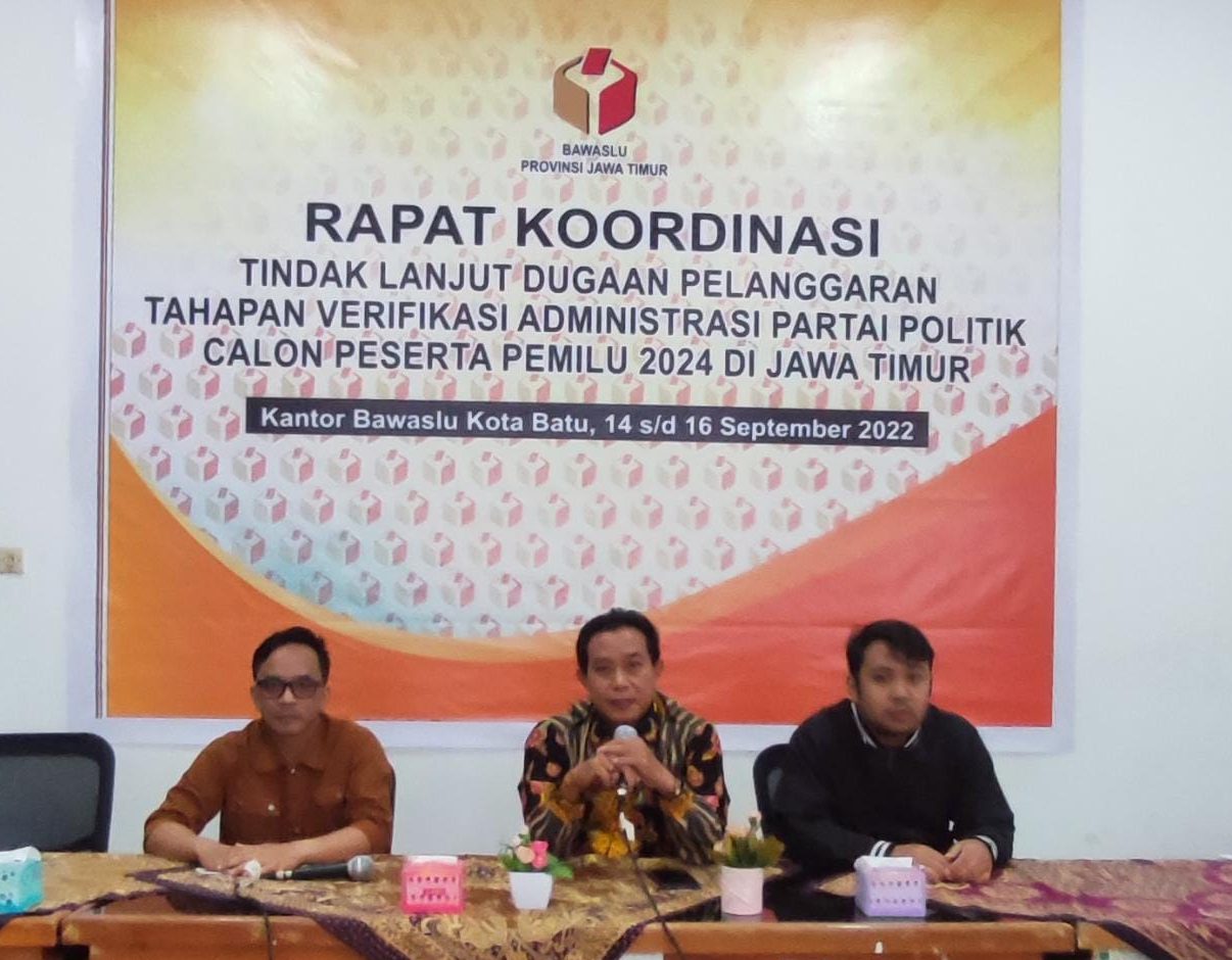 madiunkota.bawaslu.go.id, Kota Batu - Pada hari Rabu-Jumat tanggal 14-16 September 2022, Bawaslu Jatim mengundang pengawas pemilu ditingkat Kabupaten/Kota se-Jawa Timur untuk hadir pada acara Rakor Tindak Lanjut Dugaan Pelanggaran Pada Tahapan Verifikasi Administrasi Partai Politik Calon Peserta Pemilu Tahun 2024, di Kantor Bawaslu Kota Batu.