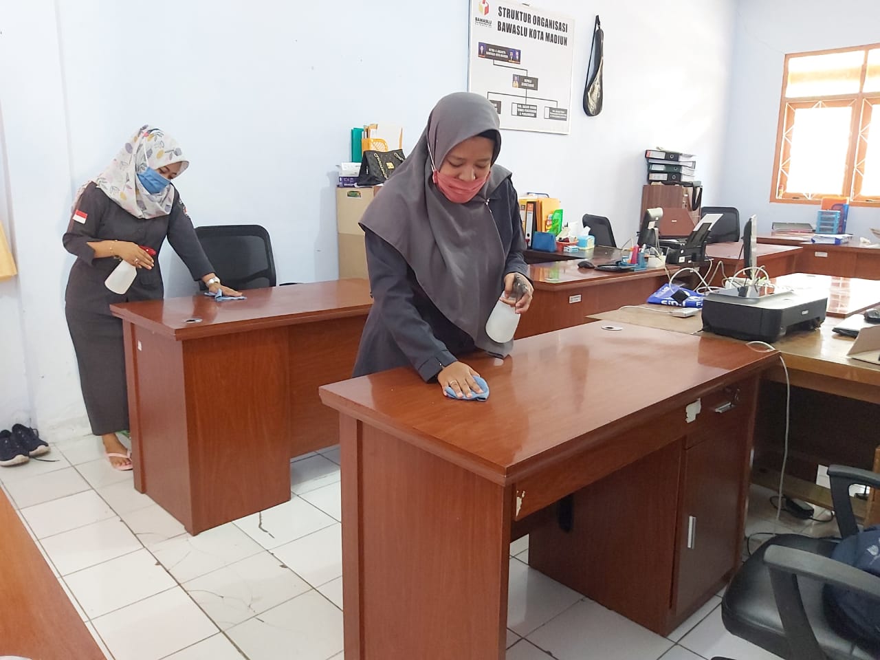 Mohda Alfian selaku Koordiv OSDM memimpin langsung kegiatan penyemprotan tersebut dibantu seluruh staf sekretariat Bawaslu Kota Madiun. Diawali dengan apel rutin setiap hari senin dilanjutkan dengan penyemprotan mulai dari halaman depan hingga seluruh ruangan kantor secara detail tidak luput dari penyemprotan.