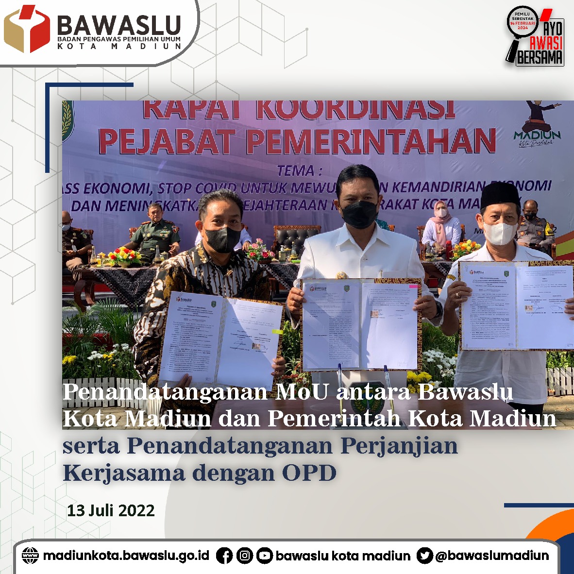 Jelang tahapan pemilu dan pilkada serentak 2024 sinergitas terus dilakukan oleh Bawaslu Kota Madiun. Pada Rabu (13/7) Bawaslu Kota Madiun melakukan kesepakatan bersama (MoU) dengan Pemerintah Daerah Kota Madiun. Kesepakatan bersama (MoU) yang ditandatangani oleh Ketua Bawaslu Kota Madiun Kokok Heru Purwoko dan Walikota Madiun, Drs. H. Maidi dilaksanakan pada saat acara coffee morning. Acara yang digagas oleh Pemerintah Daerah Kota Madiun tersebut dihadiri oleh Forkopimda, Kepala OPD, Camat, Lurah, LPMK, Tokoh masyarakat, Tokoh Agama, dan Perwakilan lembaga Pendidikan. Terjalinnya kesepakatan bersama ini menjadi landasan bagi Pemkot Madiun dan Bawaslu Kota Madiun agar pelaksanaan pesta demokrasi di Kota Madiun berkualitas.