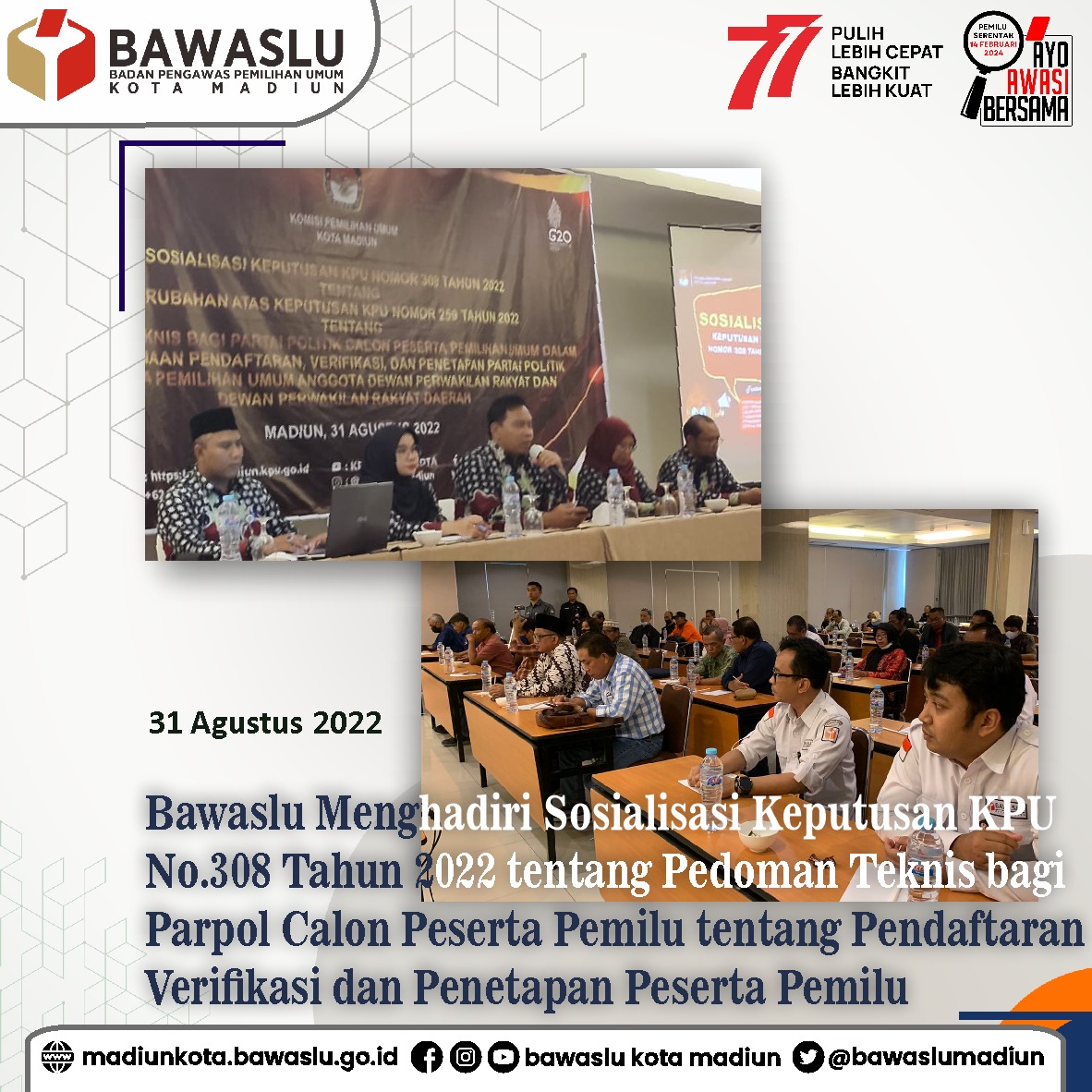 Pengawasan terhadap seluruh tahapan pemilu 2024 terus dilakukan oleh Bawaslu Kota Madiun. Pada Rabu (31/8) Bawaslu Kota Madiun menghadiri sosialisasi Keputusan KPU no. 308 tahun 2022 yang diselenggarakan oleh KPU Kota Madiun. Hadir pada acara tersebut Ketua Bawaslu Kota Madiun, Kokok Heru Purwoko dan Koordiv. SDM Bawaslu Kota Madiun, Mohda Alfian ditemani oleh 2 orang staf, Setiya Hatta Kurniawan dan Budiyanto. Acara dibuka oleh Ketua KPU Kota Madiun, Wisnu Wardhana dan dihadiri Kepala Badan Kesatuan Bangsa dan Politik (BAKESBANGPOL) Kota Madiun serta perwakilan pengurus partai politik calon peserta pemilu. Bawaslu Kota Madiun yang diundang pada acara sosialiasasi tersebut memaparkan hasil pengawasan yang dilakukan dalam tahapan verifikasi administrasi.