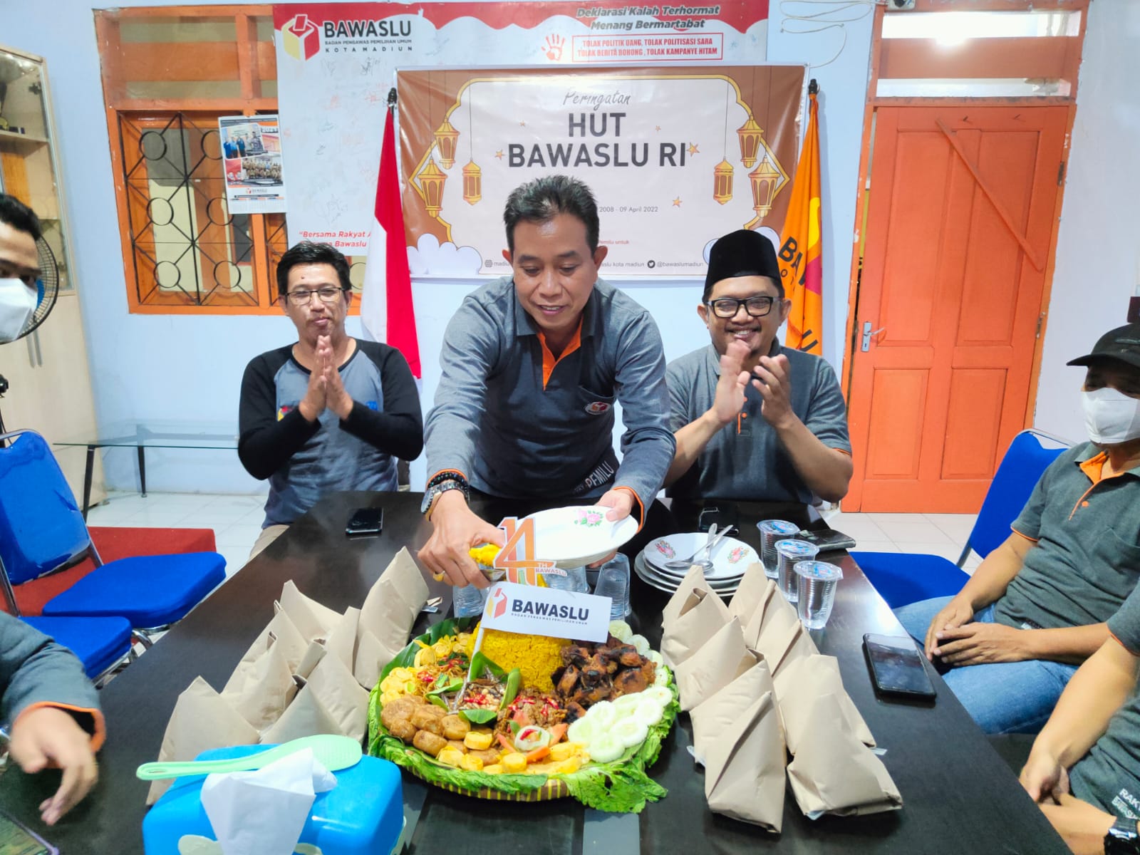 "Memperingati 14 tahun Bawaslu RI dan bertepatan dengan dimulainya tahapan pemilu 2024 pada tahun ini, harapannya untuk kita semua harus mempersiapkan kinerja, terlebih dari segi Sumber Daya Manusia, harus siap mulai dari sekarang, minimal bila ada laporan dari masyarakat di kantor Bawaslu ini semua staf bisa menerima laporan tersebut" Sambut Kokok Heru Purwoko, SH, MH selaku ketua Bawaslu Kota Madiun