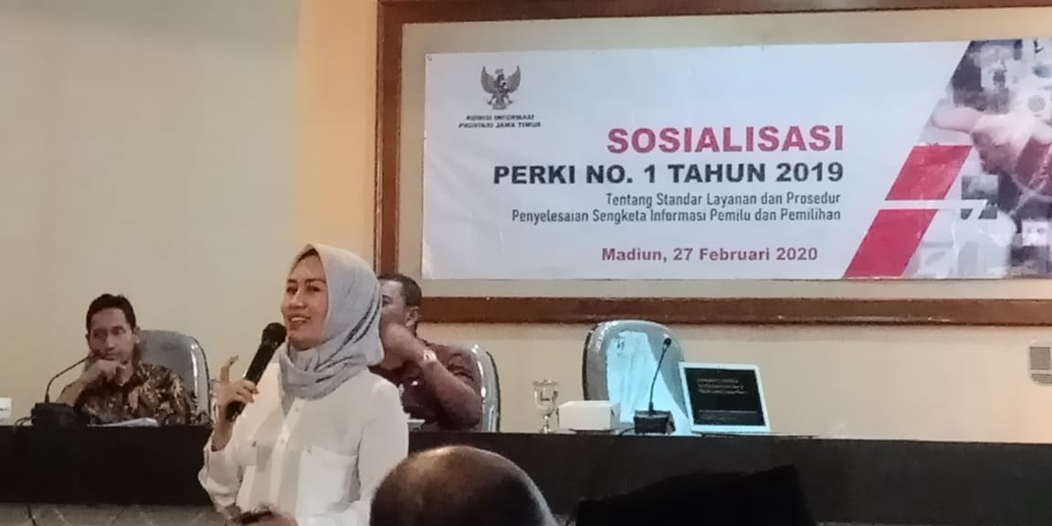 madiunkota.bawaslu.go.id, Kota Madiun- Bawaslu Kota Madiun sebagai sebuah lembaga publik selalu berkomitmen dalam memenuhi kebutuhan informasi masyarakat tentang kepemiluan. Salah satu upayanya dengan proaktif menghadiri Sosialisasi Peraturan Komisi Informasi (Per-KI) No.1 Tahun 2019, tentang Standar Layanan dan Prosedur Penyelesaian Sengketa Informasi Pemilu dan Pemilihan yang digelar oleh Komisi Informasi Publik (KIP) Jawa Timur bertempat di Bakorwil Madiun Jl. Pahlawan Kota Madiun, Kamis (27/02/2020).