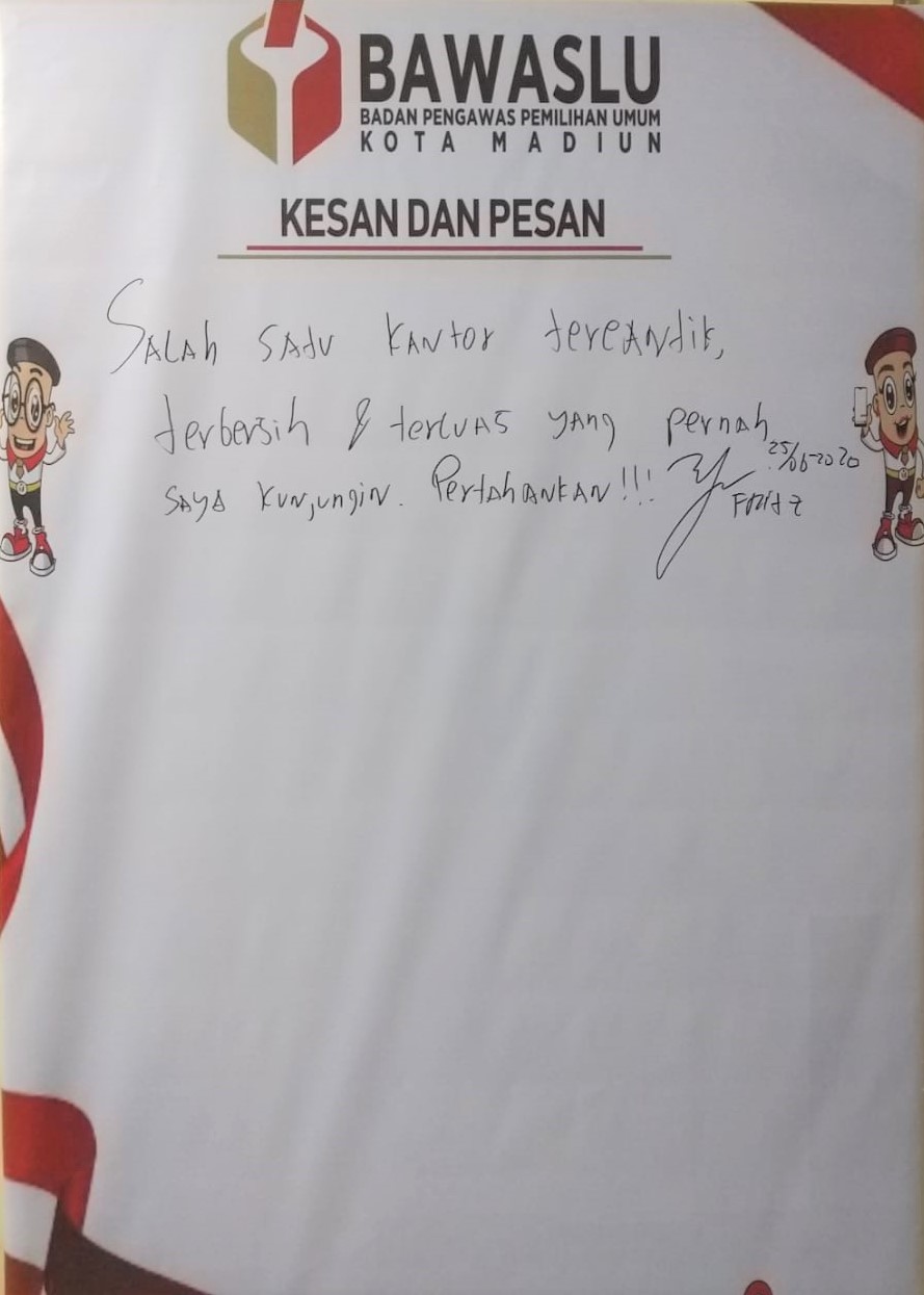 "Kantor tercantik, terbersih dan terbesar yang pernah saya kunjungin, pertahankan," kesan dan pesan Fritz yang ia tuliskan disebuah media papan yang telah disiapkan.