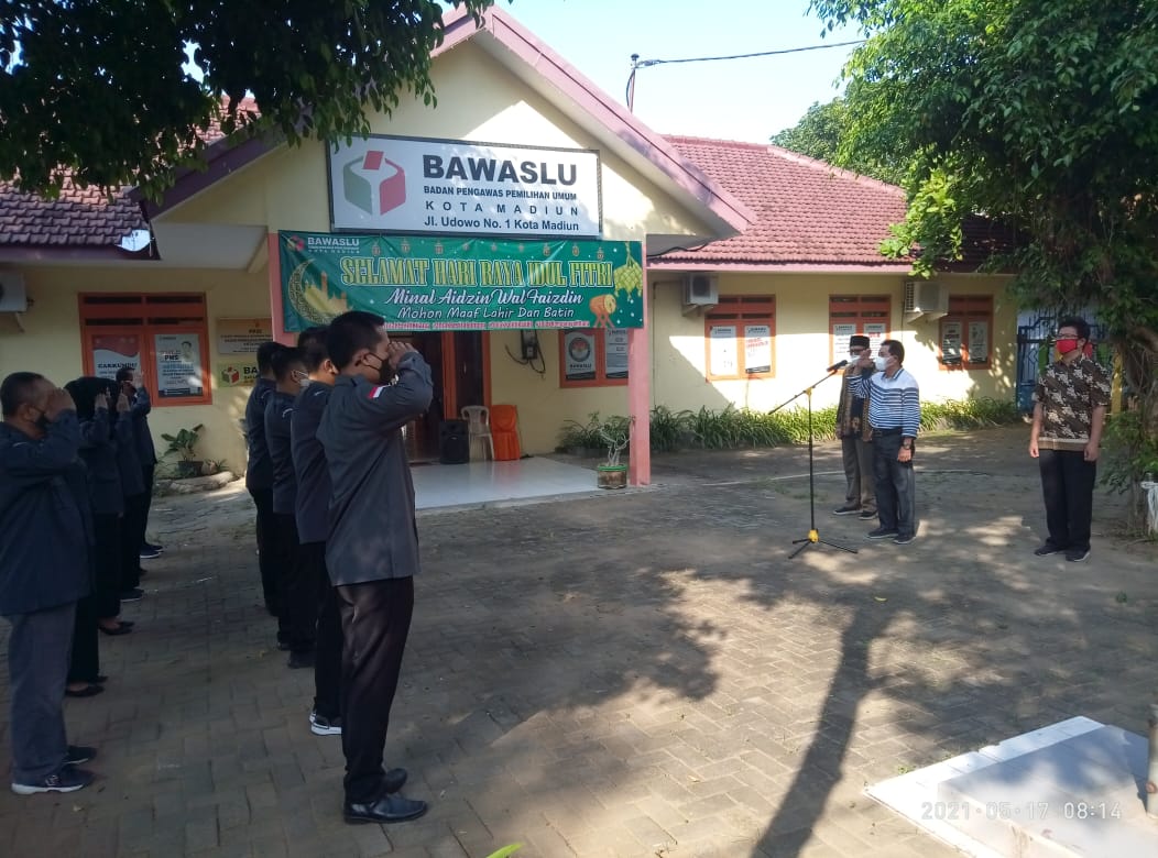 “Pada momentum Idul Fitri pada bulan syawal 1442 H ini, kami atas nama pribadi dan mewakili segenap pimpinan Bawaslu Kota Madiun menyampaikan mohon maaf lahir dan batin. Mari kita jadikan momen ini sebagai perbaikan dan peningkatan kualitas pribadi maupun kinerja untuk lembaga kita ini. Semoga kita semua menjadi pribadi yang baru, yang lebih baik,” nasehat Ketua Bawaslu Kota Madiun, Kokok Heru Purwoko dalam kesempatan apel tersebut.