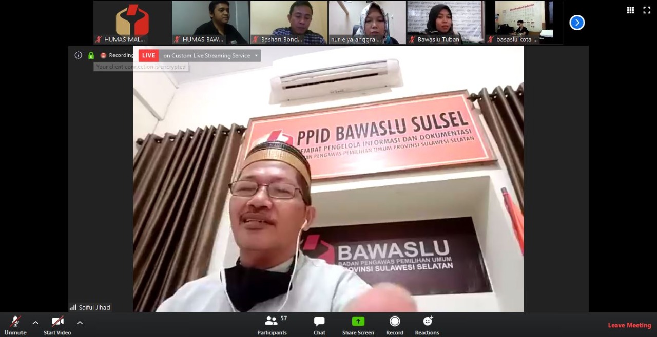 Ngabuburit online yang disiarkan langsung online melalui channel Youtube Bawaslu Jatim menghadirkan narasumber yang usah berpengalaman dalam menjalin hubungan antarlambaga di Sulawesi Selatan yaitu Syaiful Sihad Anggota Bawaslu Provinsi Sulawesi Selatan.