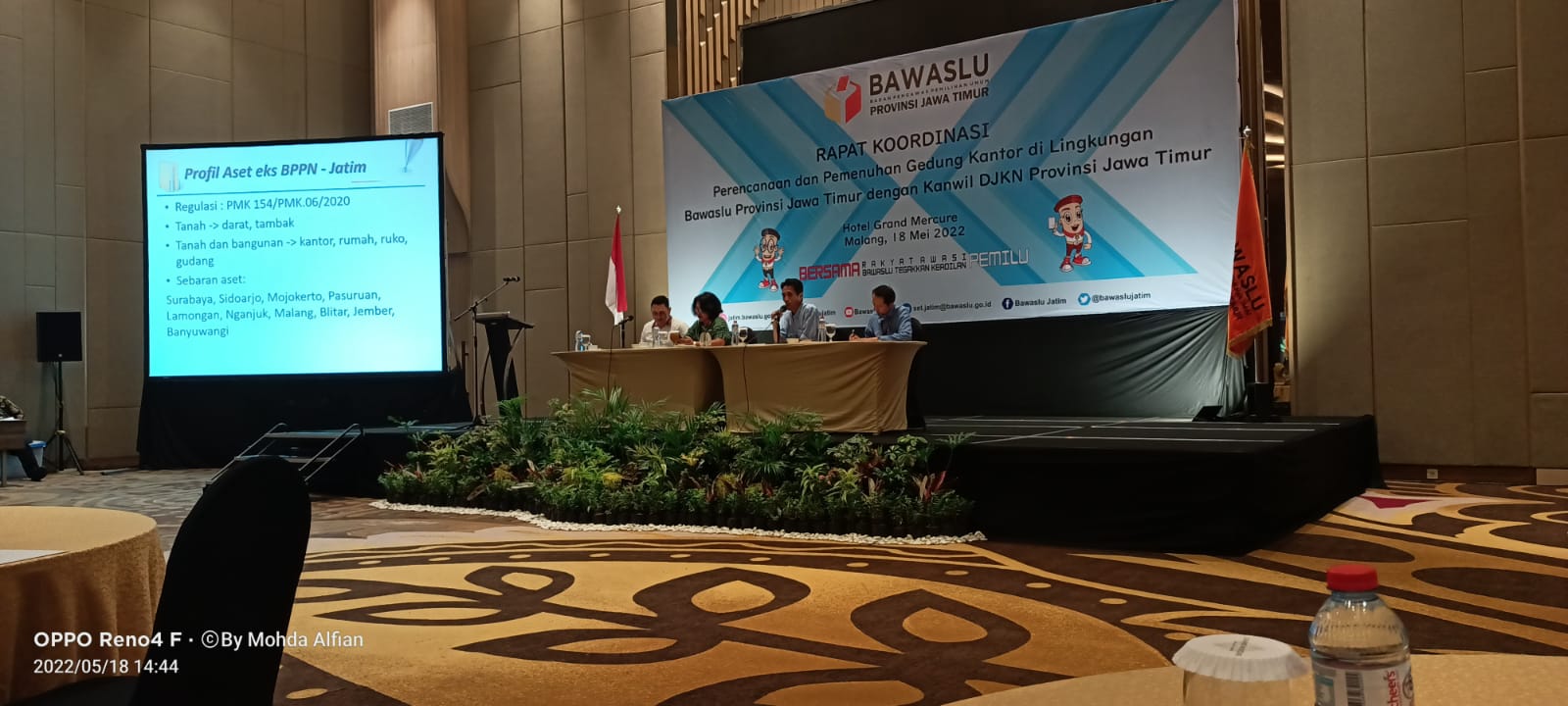 Kabag Administrasi Bawaslu Jatim, Tri Adiyanto Baay melaporkan bahwa tujuan kegiatan ini dalam rangka persiapan tahapan Pemilu dan Pemilihan khususnya terkait perencanaan dan pemenuhan sarana prasarana bangunan gedung kantor Bawaslu Jatim, maupun Bawaslu Kabupaten/Kota se Jawa Timur dengan mengajak narasumber Agus Prasetya dan Slamet Sudirman dari Kanwil Direktorat Jenderal Kekayaan Negara (DJKN) Provinsi Jawa Timur.