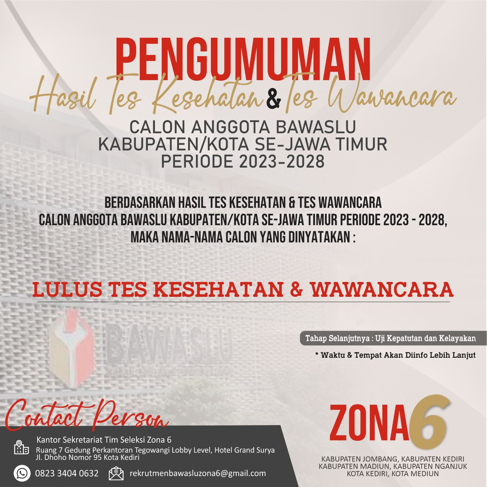 PENGUMUMAN HASIL TES KESEHATAN DAN TES WAWANCARA BAKAL CALON ANGGOTA BAWASLU KABUPATEN/KOTA SE-JAWA TIMUR MASA JABATAN 2023-2028-ZONA6