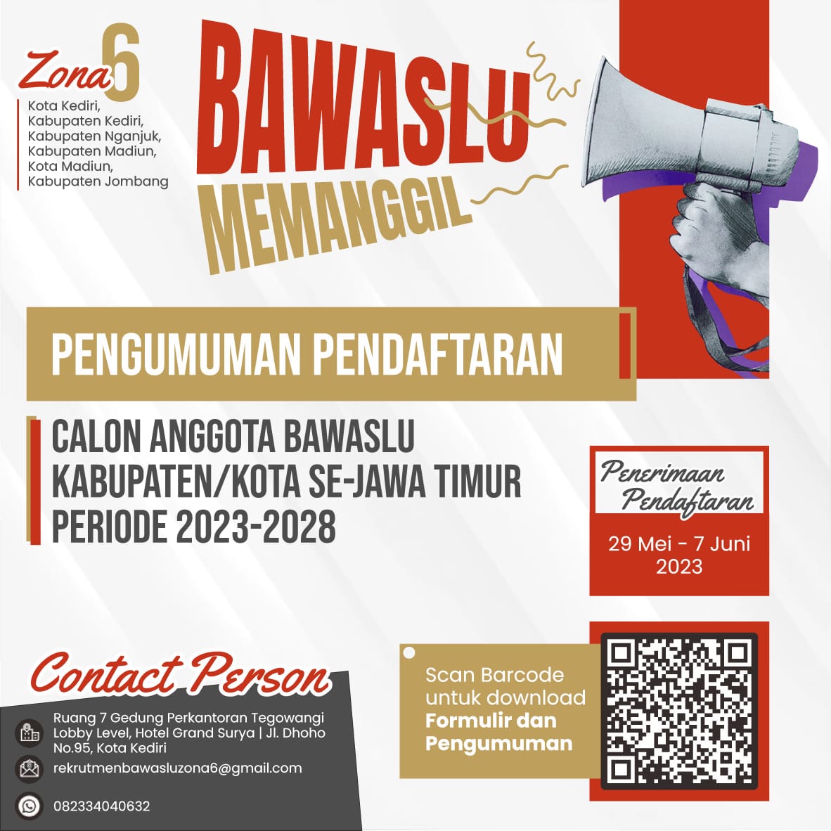 PENGUMUMAN PENDAFTARAN CALON ANGGOTA BAWASLU KABUPATEN/KOTA SE-JAWA TIMUR ZONA 6 (KOTA KEDIRI, KABUPATEN KEDIRI, KABUPATEN NGANJUK, KABUPATEN MADIUN, KOTA MADIUN DAN KABUPATEN JOMBANG) MASA JABATAN 2023-2028