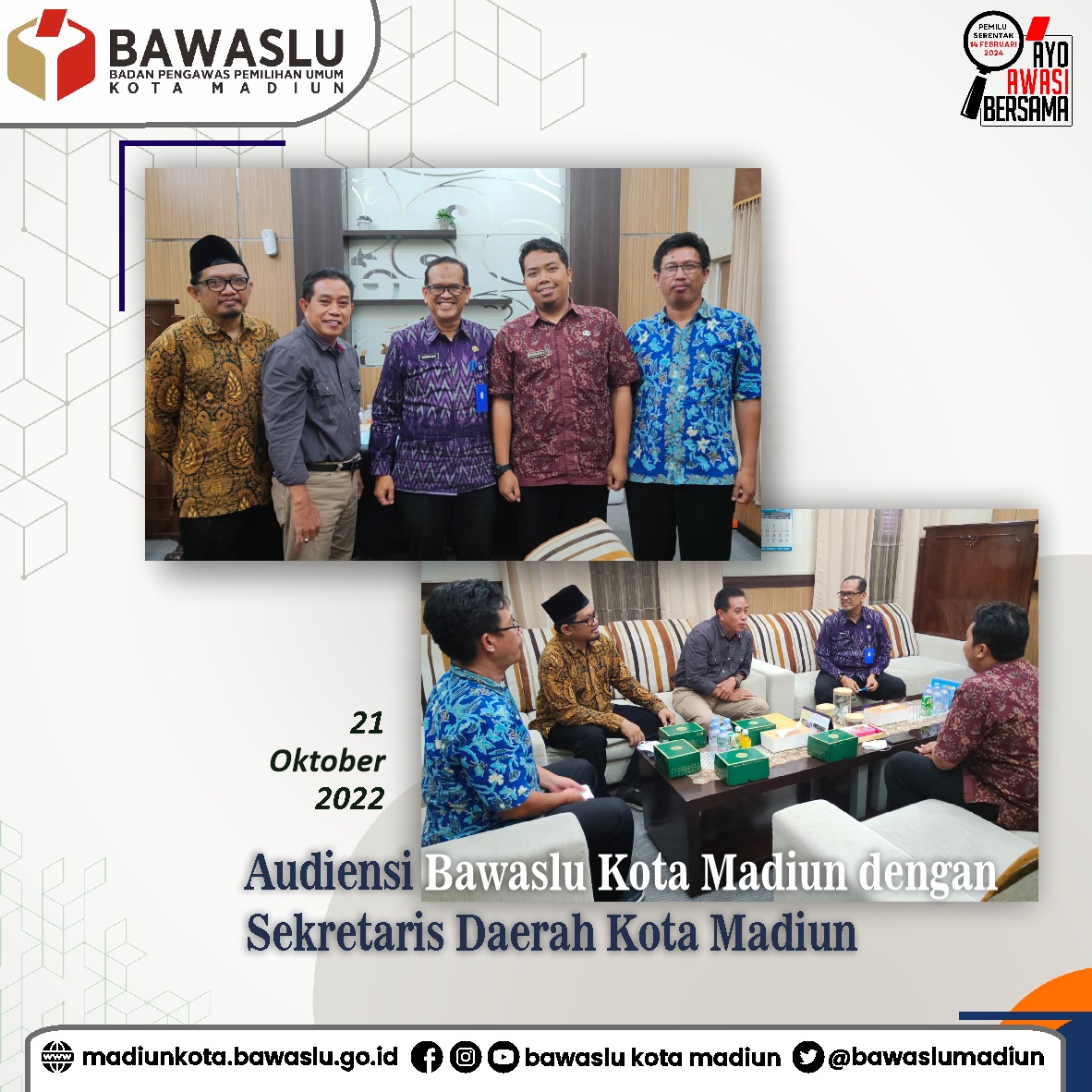 Audiensi anatara Bawaslu Kota Madiun dan Sekretaris Daerah Kota Madiun ini selain meminta tenaga PNS di Bawaslu Kota Madiun, juga membahas tentang fasilitasi Pemerintah Daerah Kota Madiun dalam pembentukan sekretariatan Panitia Pengawas Pemilu (Panwaslu) Kecamatan se-Kota Madiun. Baik dari sektor administrasi kantor sekretariat serta tenaga ASN di tingkat Panwaslu Kecamatan di tiap kecamatan se – Kota Madiun.