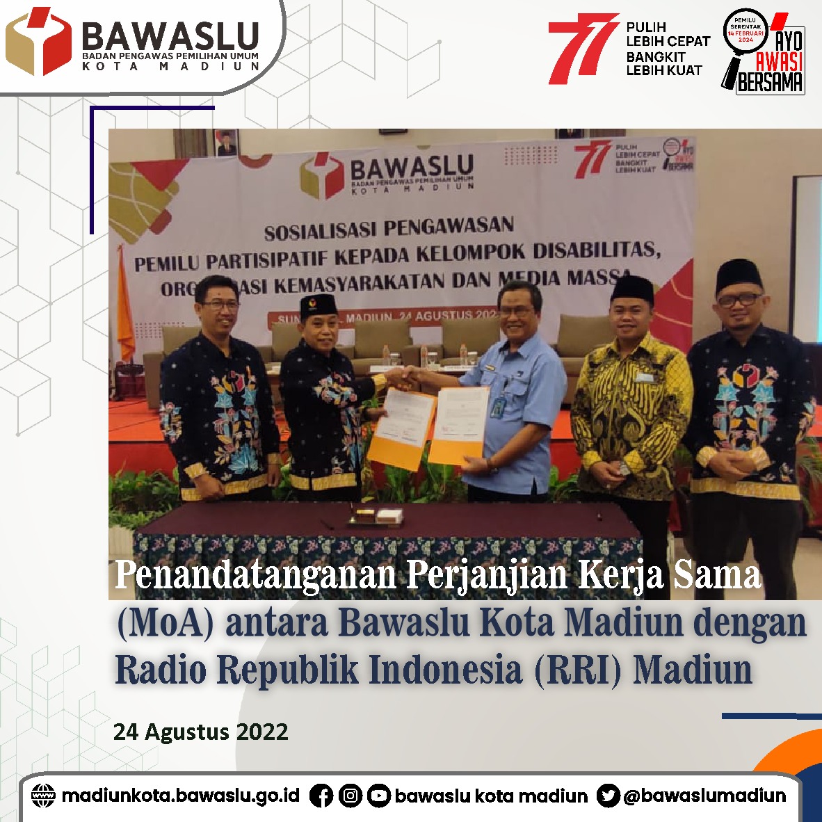 Madiunkota.bawaslu.go.id, Kota Madiun- Menyongsong tahapan Pemilu serentak 2024, Bawaslu Kota Madiun sepakat menjalin kerja sama untuk sosialisasi pencegahan dan pengawasan pemilihan umum dan pemilihan kepala daerah serentak bersama Lembaga Penyiaran Publik Radio Republik Indonesia (LPP RRI) Madiun. Perjanjian kerja sama tersebut sebagai wujud penguatan fungsi hubungan antar kelembagaan Bawaslu Kota Madiun bersama stakeholder. Penandatanganan perjanjian kerja sama tersebut dilaksanakan disela acara sosialisasi pengawasan pemilu partisipatif kepada kelompok penyandang disabilitas, ormas dan media massa pada Rabu (24/08/2022) bertempat di ballroom Sun City Hotel Madiun, Jalan S.Parman No. 8 Kota Madiun.