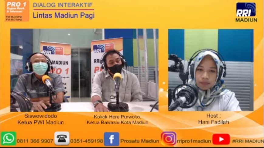 madiunkota.bawaslu.go.id, Kota Madiun-Ketua Bawaslu Kota Madiun Kokok Heru Purwoko pada hari Selasa 8 Februari 2022 menjadi narasumber pada kegiatan dialog interaktif yang diselenggarakan oleh RRI Madiun bersama dengan narasumber lainnya yaitu ketua Persatuan Wartawan Indonesia (PWI) Madiun Siswowidodo. Tema dialog interktif tersebut adalah “Peran Media Masa dalam Mengawal Tahapan Pemilu”.