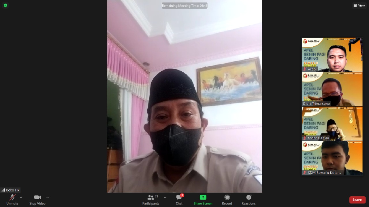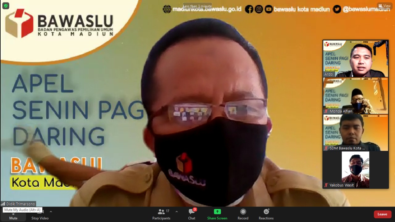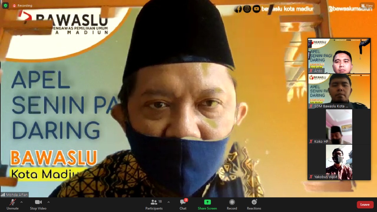 Bawaslu Kota Madiun pada senin (5/7) melaksanakan apel pagi secara daring. Apel yang dilaksanakan melalui aplikasi zoom tersebut diikuti oleh seluruh jajaran sekretariat. Apel yang dipimpin oleh Ketua Bawaslu Kota Madiun dilakukan secara daring untuk menggantikan apel secara tatap muka. "Karena kondisi di Kota Madiun sedang diterapkan PPKM Darurat, maka apel dilakukan secara daring. Saya berharap seluruh jajaran Bawaslu Kota Madiun, baik staf, Korsek, maupun Komisioner tetap menerapkan protokol kesehatan secara ketat." Ujar Kokok Heru Purwoko.