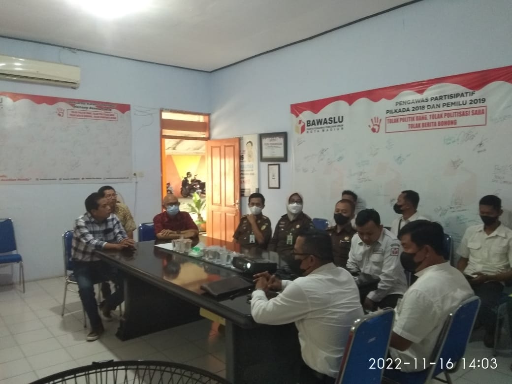 Rapat bersama untuk dengan Kejaksaan dan Kepolisian yang tergabung dalam sentra penegakan hukum terpadu (Gakkumdu) di Kantor Bawaslu Kota Madiun pada Rabu (17/11). Hadir pada rapat tersebut di hadiri oleh Kepala Kejaksaan Negeri Kota Madiun, Kasat Reskrim, Kasat Intel Polres Madiun Kota, serta jajaran kepolisian dan kejaksaan yang tergabung dalam Sentra Gakkumdu. Selain itu, dari internal Bawaslu Kota Madiun dihadiri oleh Ketua Bawaslu Kota Madiun, Kokok Heru Purwoko, Koordiv. Penanganan Pelanggaran dan Penyelesaian Sengketa, Yakobus Wasit Supodo.