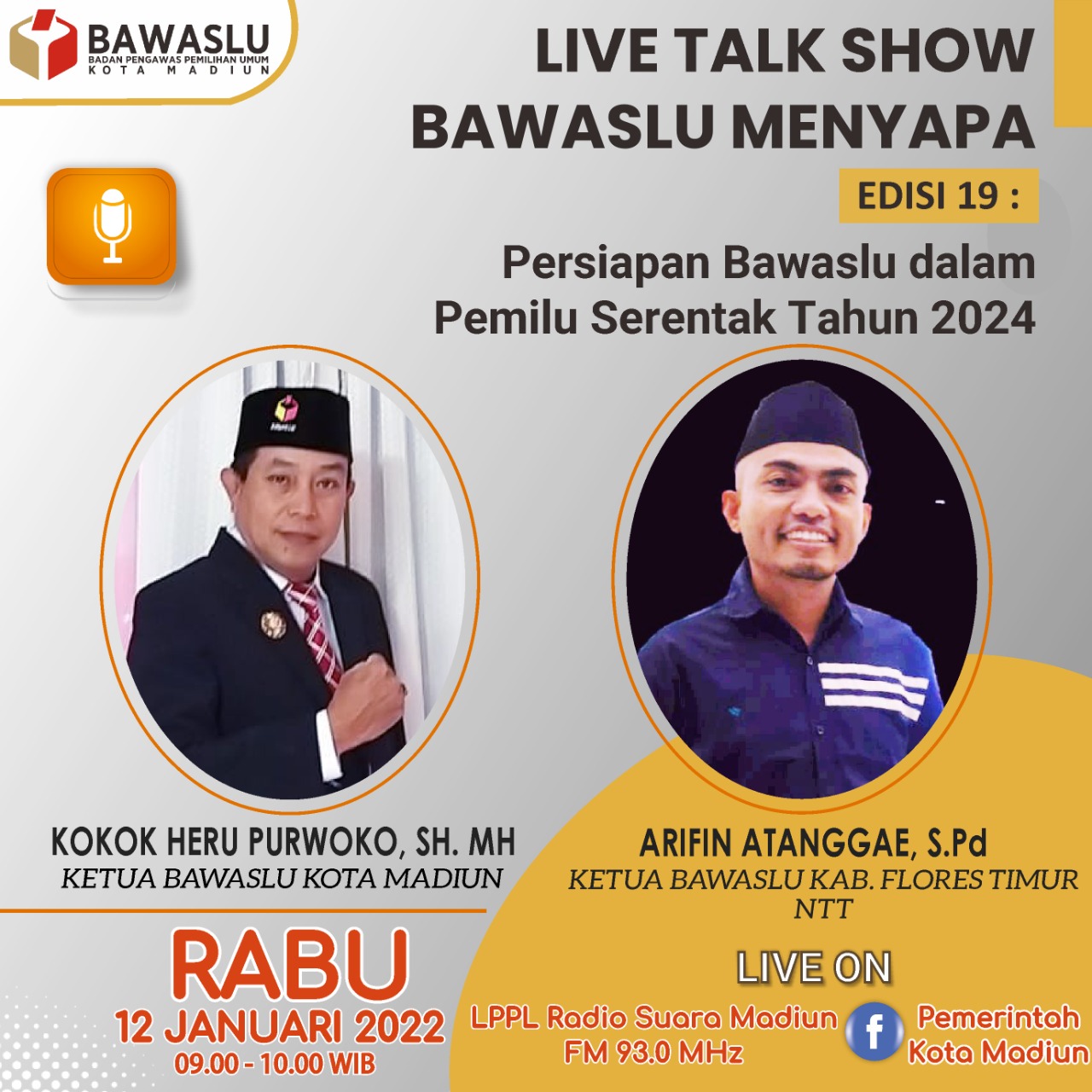 Pada rabu (12/1), Ketua Bawaslu Kota Madiun, Kokok Heru Purwoko yang menjadi narasumber pada talkshow Bawaslu Menyapa bersama LPPL Suara Madiun menyatakan kesiapan Bawaslu menyongsong pemilu serentak 2024. “Pemilu serentak 2024 kedepannya Bawaslu siap mengawasi. Pembinaan kualitas SDM maupun peningkatan kompetensi jajaran struktur organisasi kelembagaan agar lebih siap karena kita punya pengalaman pemilu 2019. Kota Madiun aman, tertib dan berjalan dengan lancar pada pemilu 2019 kemarin.” Ujar Kokok.