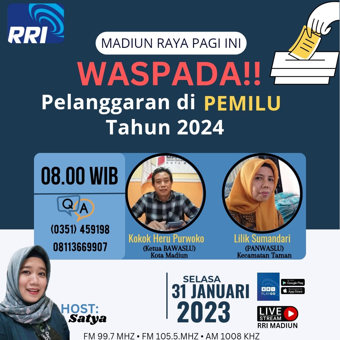 Tahapan pemilu tahun 2024 telah dimulai. Bawaslu Kota Madiun dalam rangka mengawasi pelaksanaan pemilu 2024, terus melakukan sosialisasi pada masyakarat. Sosialisasi dilakukan agar masyarakat terutama di Kota Madiun agar melek politik serta ikut menjadi pengawas partisipatif. Pada Rabu (31/1) Ketua Bawaslu Kota Madiun, Kokok Heru Purwoko mengatakan pengawasan telah dilakukan sejak tahun 2022. Hal tersebut dikatakan Kokok saat menjadi narasumber pada acara Dialog Pagi Bersama RRI.
