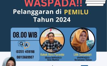Tahapan pemilu tahun 2024 telah dimulai. Bawaslu Kota Madiun dalam rangka mengawasi pelaksanaan pemilu 2024, terus melakukan sosialisasi pada masyakarat. Sosialisasi dilakukan agar masyarakat terutama di Kota Madiun agar melek politik serta ikut menjadi pengawas partisipatif.