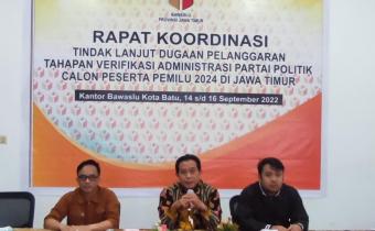 madiunkota.bawaslu.go.id, Kota Batu - Pada hari Rabu-Jumat tanggal 14-16 September 2022, Bawaslu Jatim mengundang pengawas pemilu ditingkat Kabupaten/Kota se-Jawa Timur untuk hadir pada acara Rakor Tindak Lanjut Dugaan Pelanggaran Pada Tahapan Verifikasi Administrasi Partai Polit